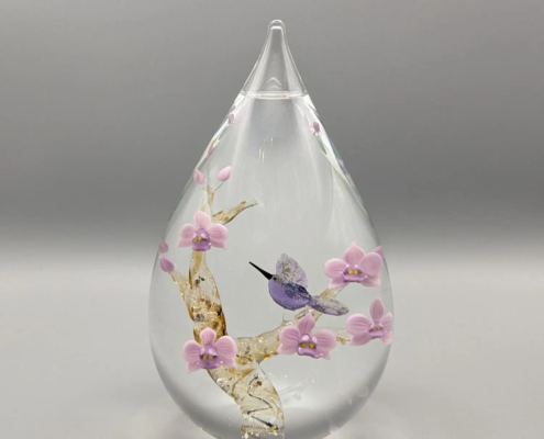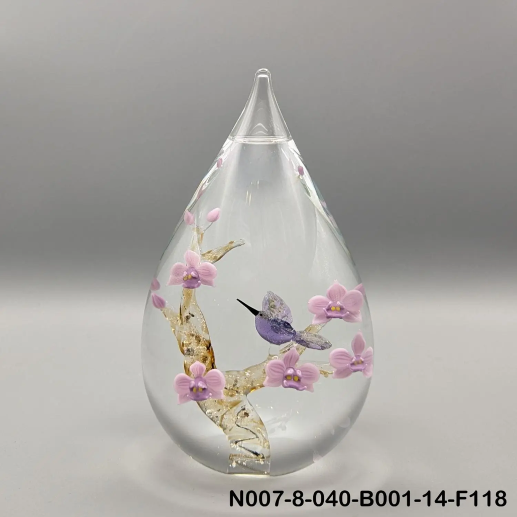 Voorbeelden van Vitrum 07-8. Een druppel of bol met een tak van blankglas met gekleurde lijnen erin waar de as in versmolten zit. Op de tak zitten bloemetjes en bijvoorbeeld een vogel of vlinder.