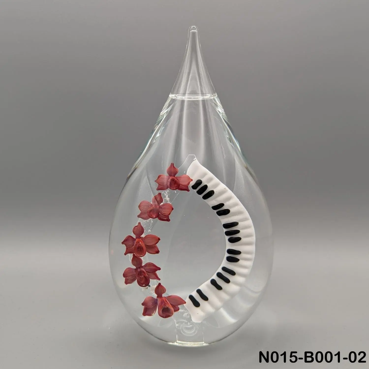 Bij deze variant is er in de buitenvorm een gebogen toetsenbord van een piano gemaakt. In de andere boog is een klein beetje as versmolten. In dit geval zitten daar paarse bloemetjes op, maar dat kan ook in een andere kleur of als ander figuur gemaakt worden.